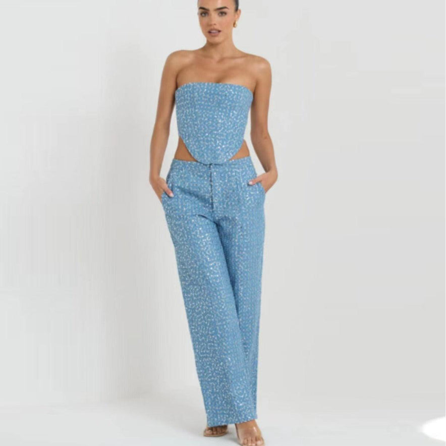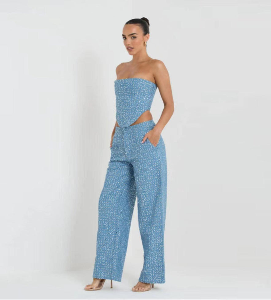 Fashion Denim Sequined Tube Top Wide Leg Pants Suit