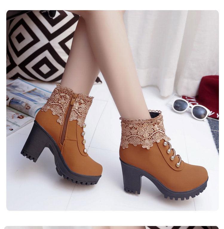 Fashion Embroidered Side Zipper And Cotton High Heels Tide