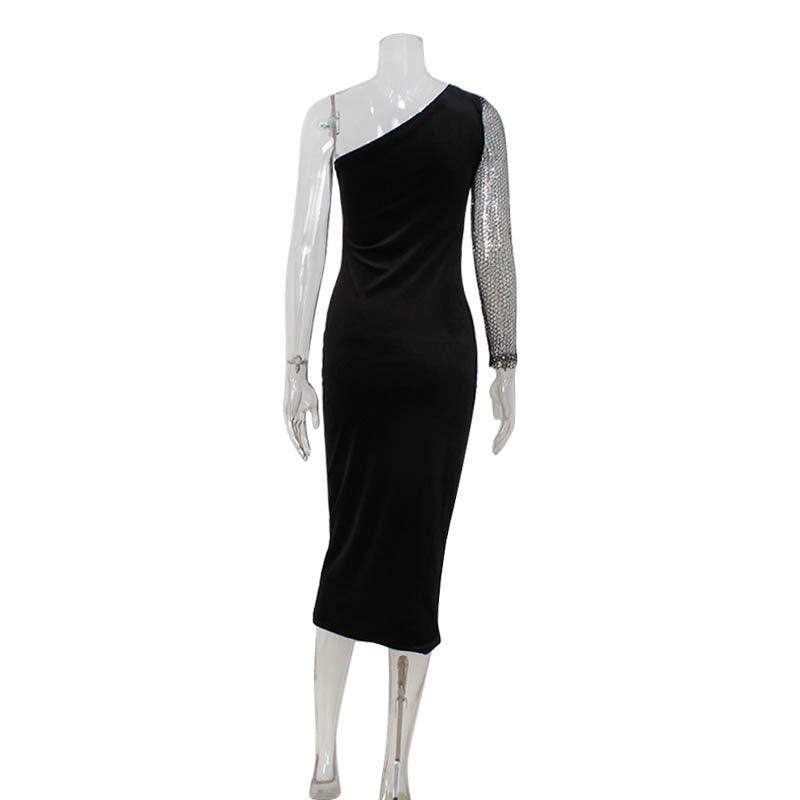 Fashionable Sequins Stitching Shoulder Diagonal Collar Dress