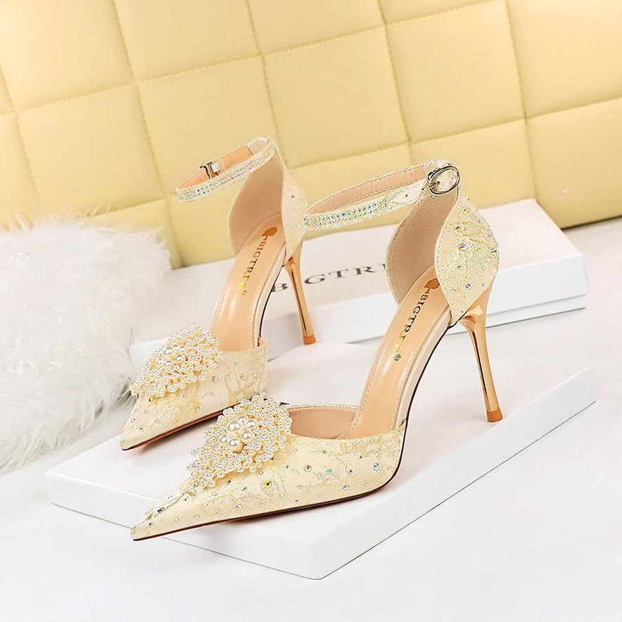 Low-cut Hollow One-word With Pointed Toe Rhinestone Pearl Flower Sandals High Heels