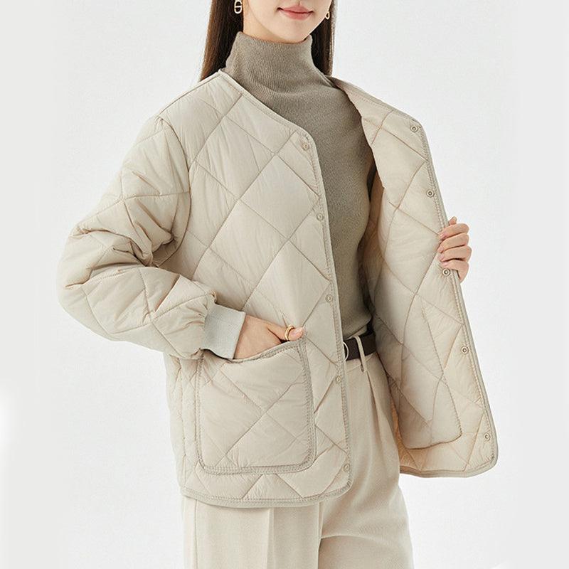New Rhombus Sewing Cotton Coat Winter Warm Round-neck Jacket With Pockets Lightweight Outerwear For Women's Clothing
