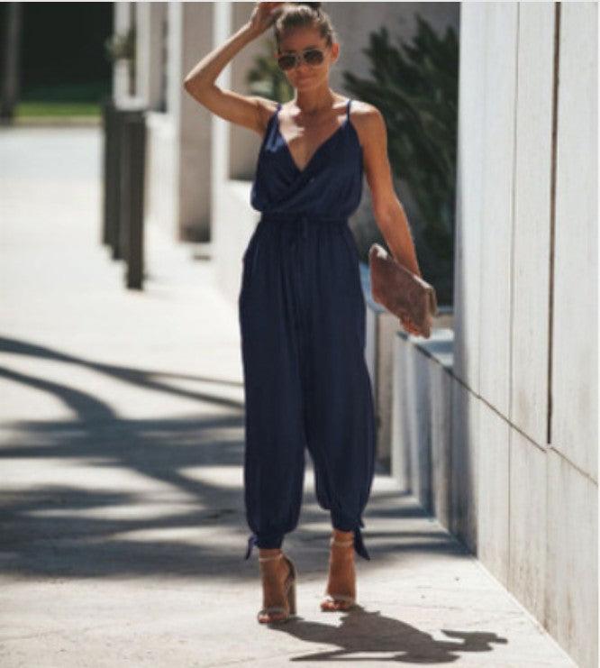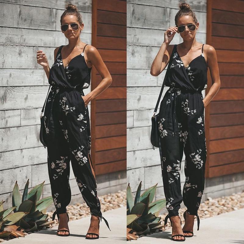 Printed sexy backless tether pocket sling V-neck female jumpsuit