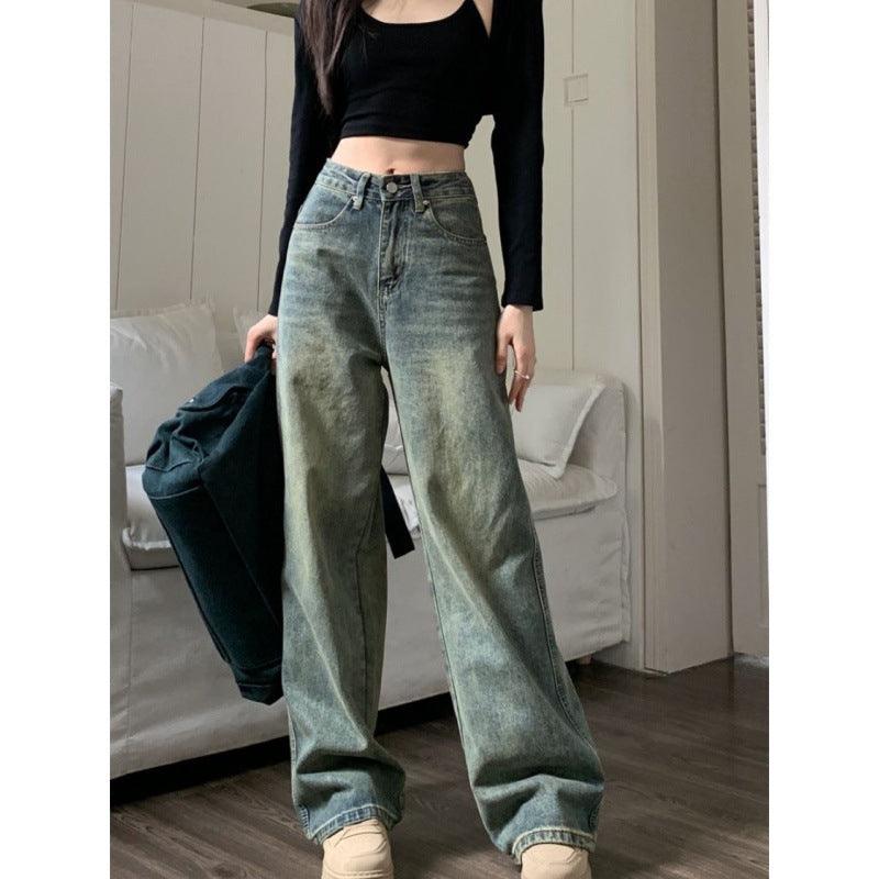 Retro Denim Women's Worn Looking Washed-out Straight Loose Figure Flattering Wide Leg Pants