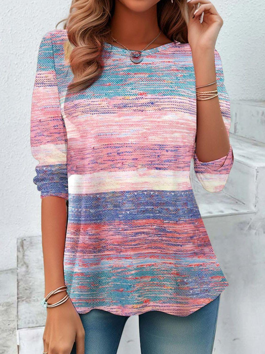 Round Neck Long Sleeve Striped Tie-dye Casual Top