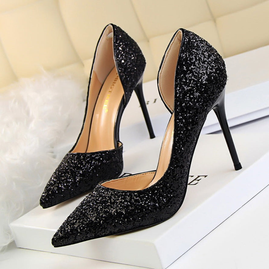 Skinny Women's Shoes Stiletto Heel Shallow Mouth Pointed Side Hollow-out Sequin