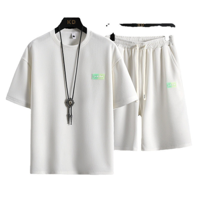 Tracksuit Short Sleeve Set Waffle Cotton Breathable Plaid Fabric Mens Casual Two Piece Set Fashion Sports Suit