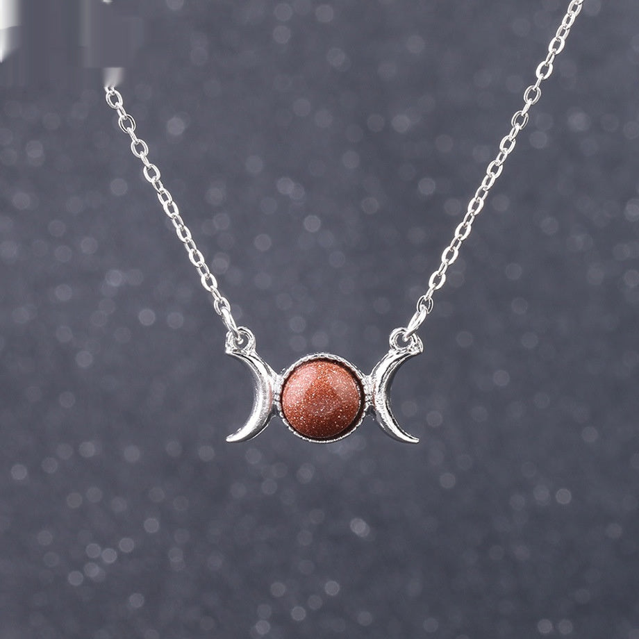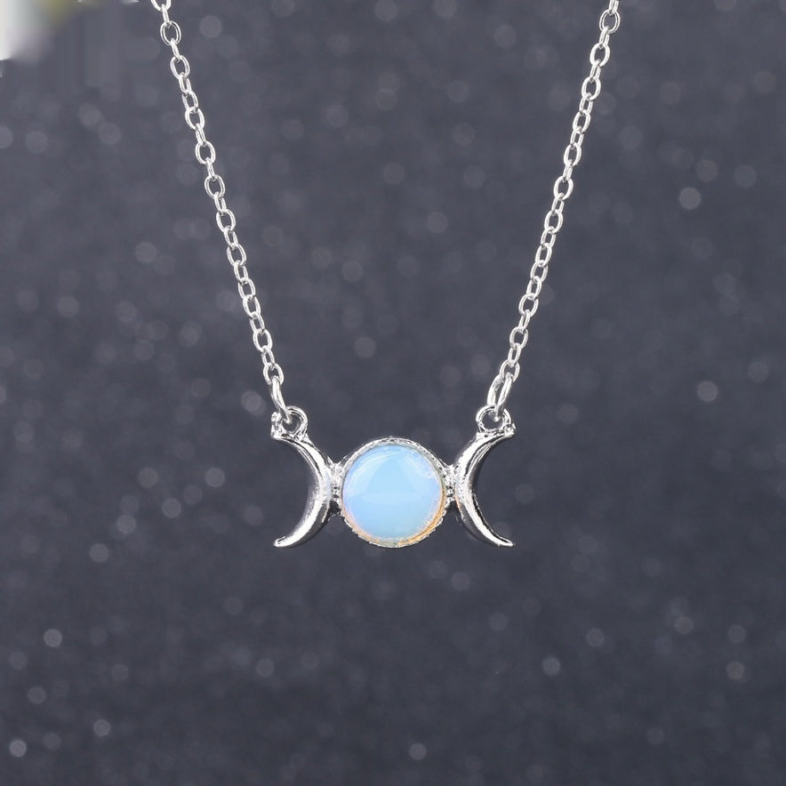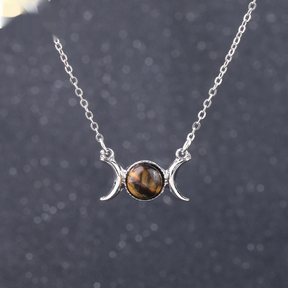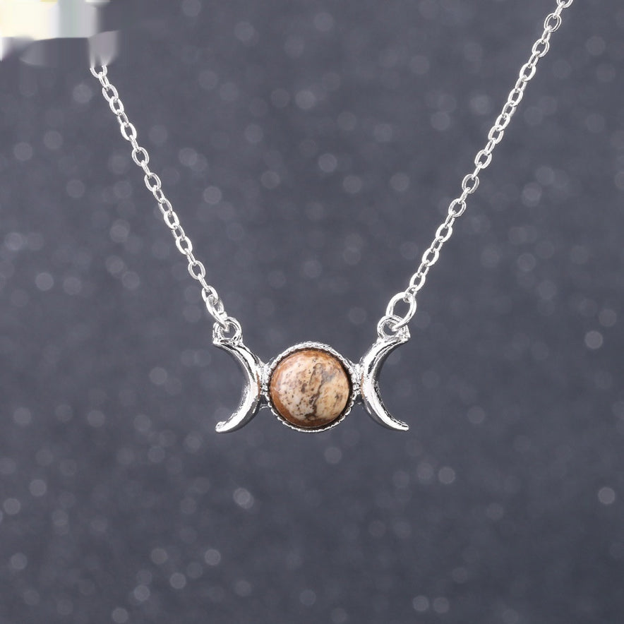 Vintage Crescent Lock Bone Moon Sun Pendant Silver Women's Natural Stone Necklace