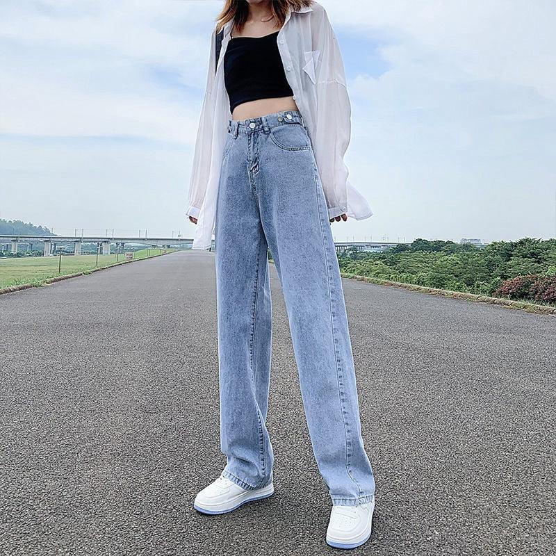 Women's Adjustable Waist Jeans High Waist Straight Pants Loose