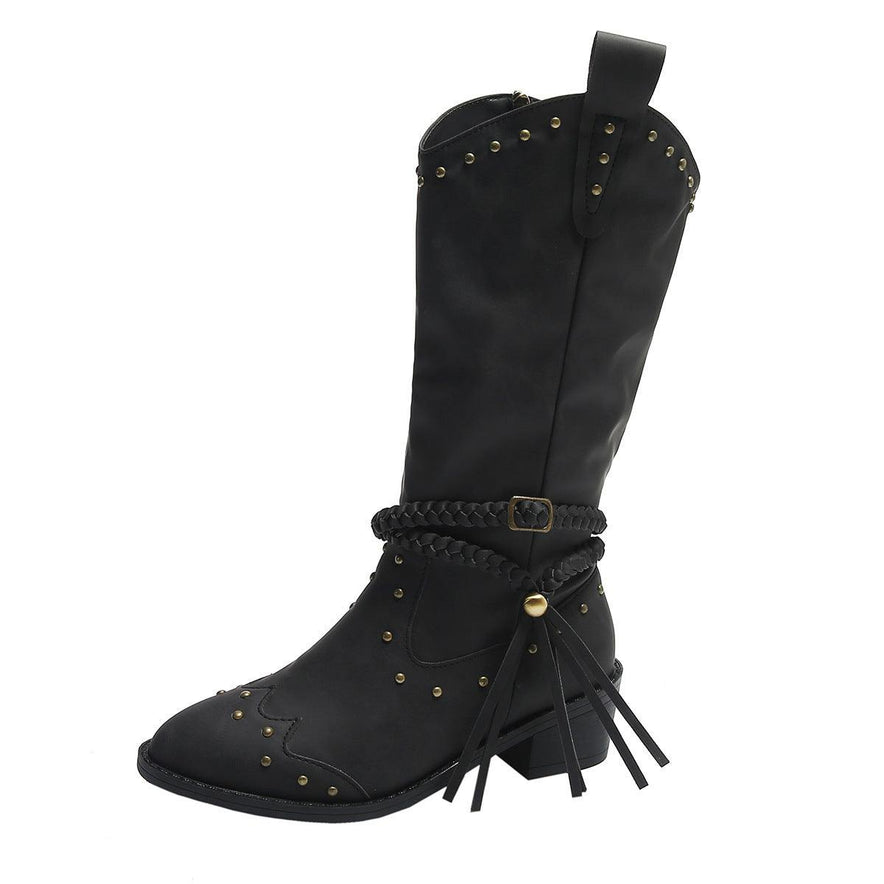 Women's Simple Pointed Rivets Thick Heel Mid Heel Long Tube Tassel Boots